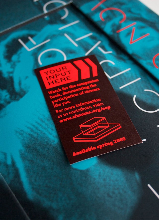 The Art of Participation: 1950 to Now exhibition presents an overview of participation-based art since the 1950s, reflecting on how artists create situations in which the public takes a collaborative role in the art-making process. The exhibit catalog’s design demands similar participation on the audience’s part by providing a space on the cover for a second, later book that will be a record of how visitor contributions change the form and content of the exhibition over its run at SFMOMA.