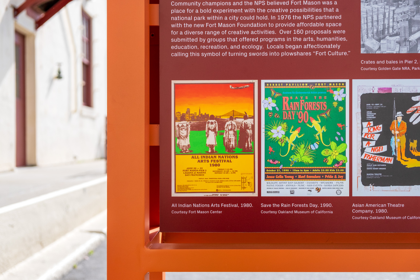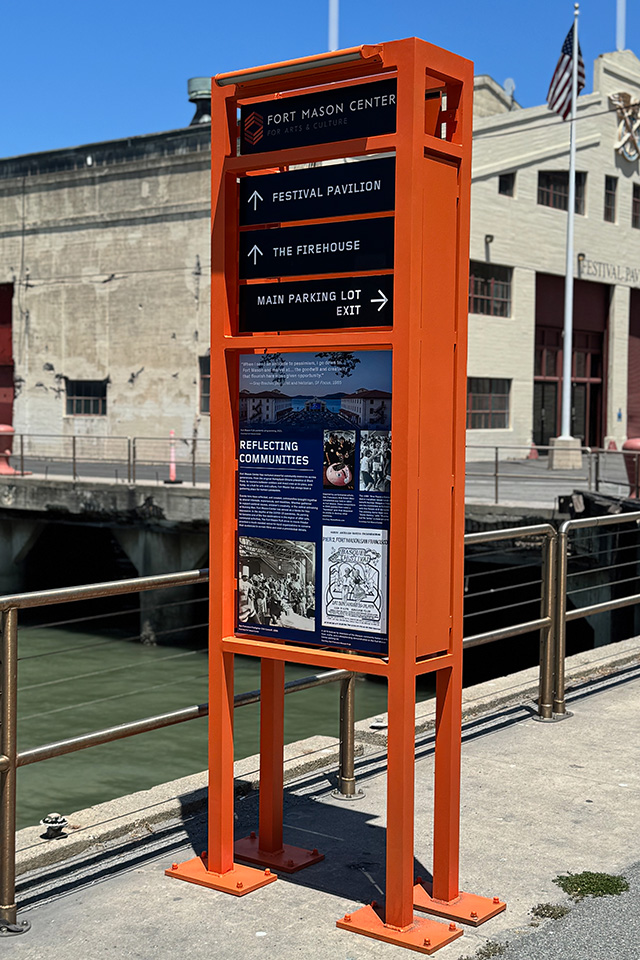 Layers of stories are strategically distributed across the campus, enriching signage and providing people with an understanding of its history. These narrative elements weave Fort Mason’s past into the present experience, offering visitors glimpses into the site’s heritage while they navigate its contemporary cultural offerings. This approach transforms functional wayfinding into moments of discovery, where learning about the place becomes part of finding your way.