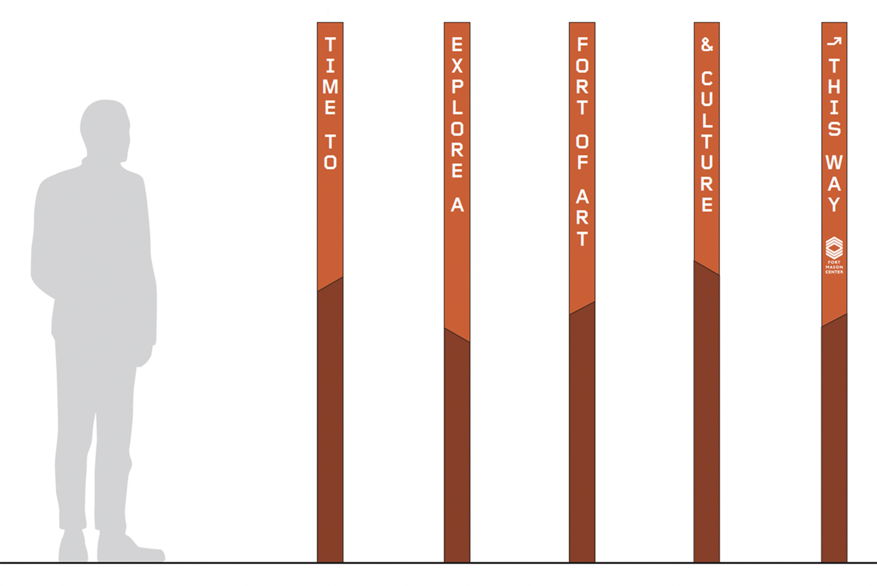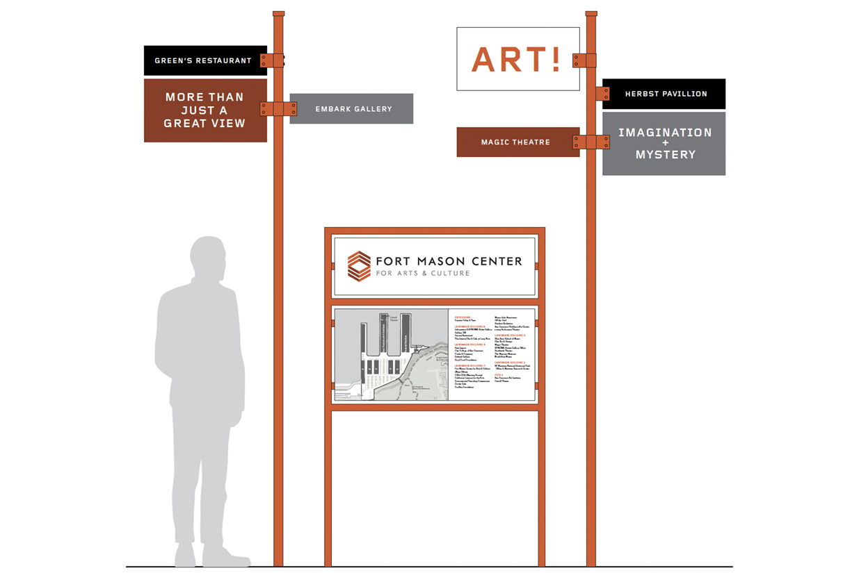During the concepting phase, artful moments were developed that await their time—bold environmental graphics that would give Fort Mason a voice as distinctive as its mission. These strategic interventions are designed to emerge from the site’s character, creating moments of discovery that celebrate both the history and the creative energy that defines the place today. They represent the soul of what Fort Mason could express about itself, and may yet find their way into reality.