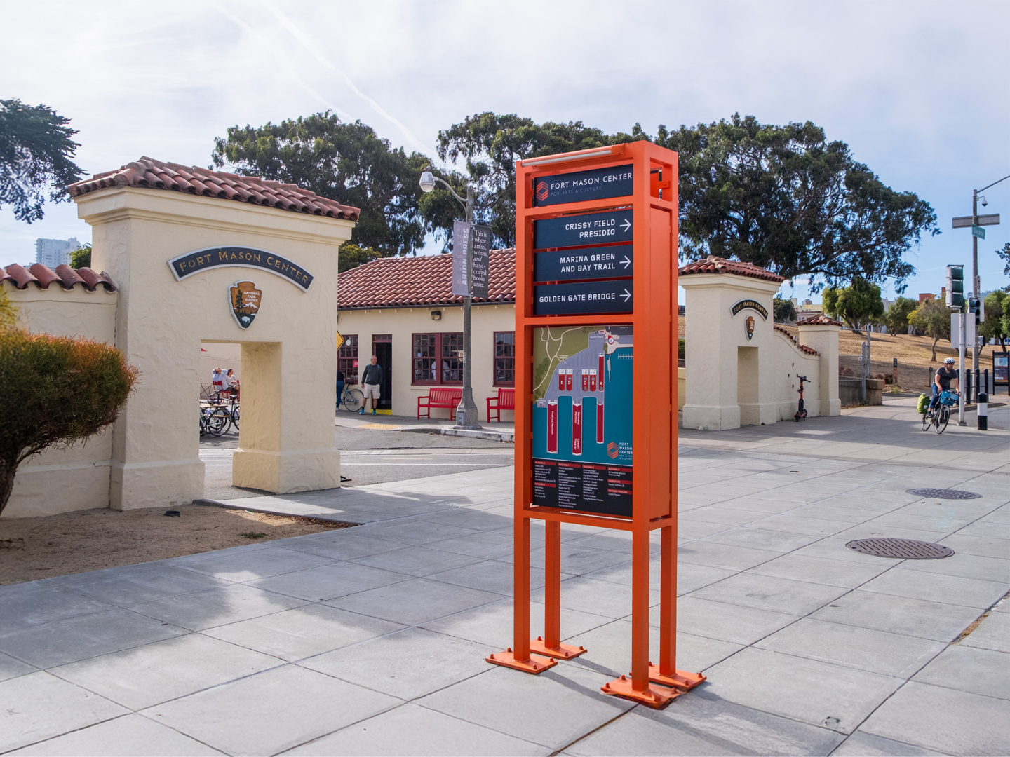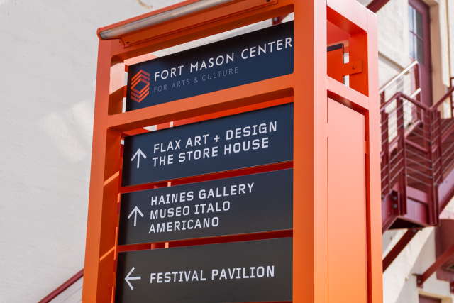 A series of functional wayfinding is found throughout the campus. Bathed in the bright and spirited orange of the Fort Mason identity, they are easy to spot in the muted environment. The system includes orientation monuments, directional signs, and interpretive panels, and can be used to create other signs as needed. The bold color choice ensures visibility while establishing a consistent visual language that unifies the sprawling site. The modular approach allows Fort Mason to expand the system organically as new programs and spaces are added.