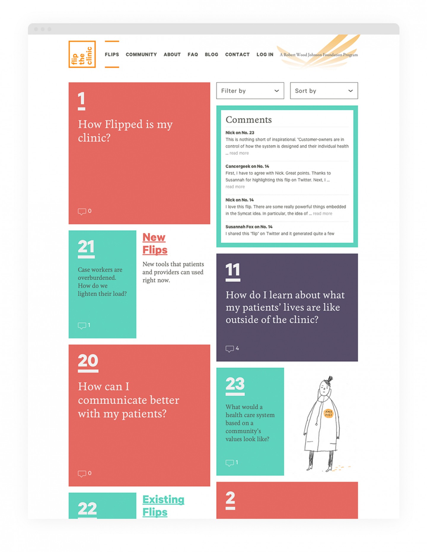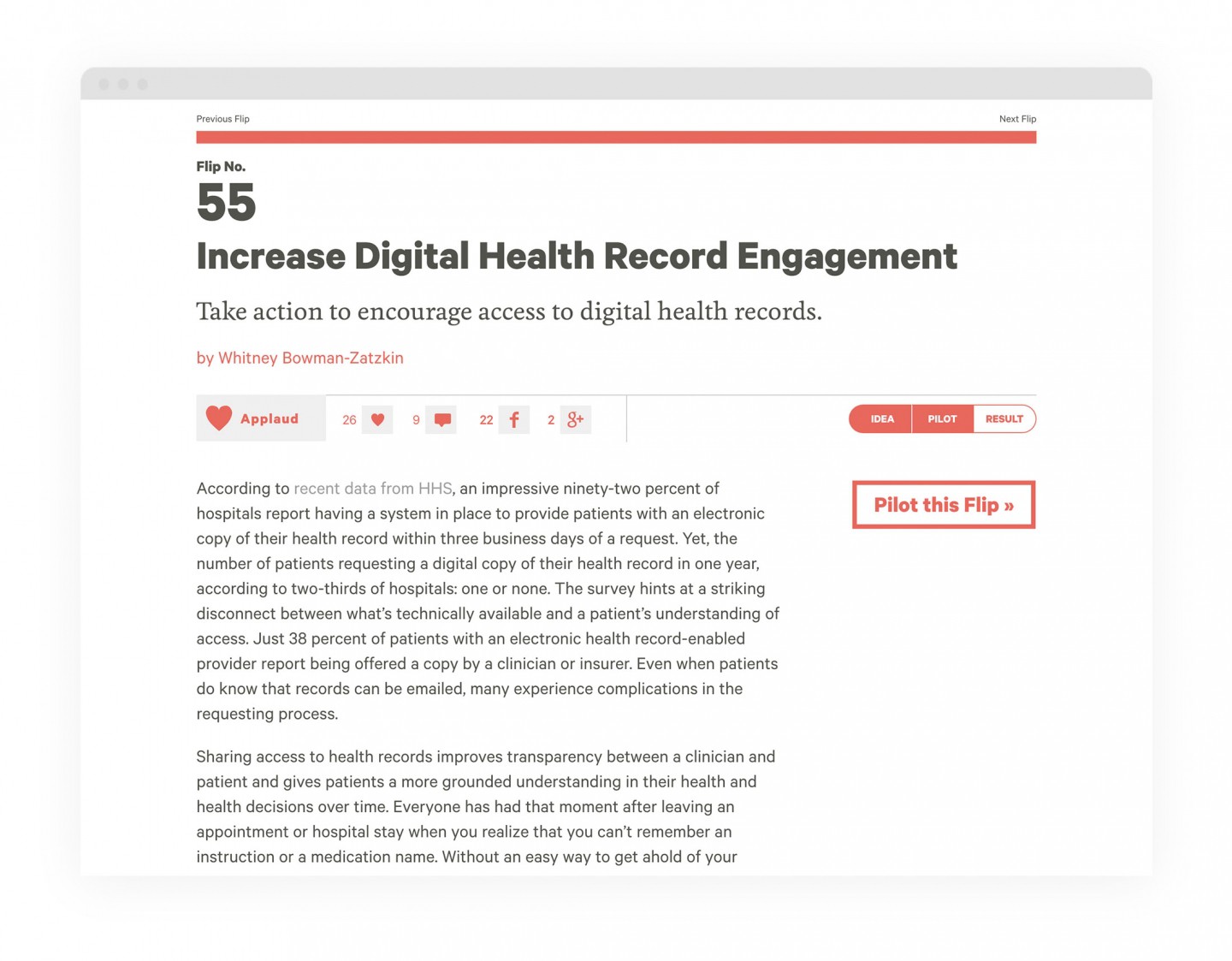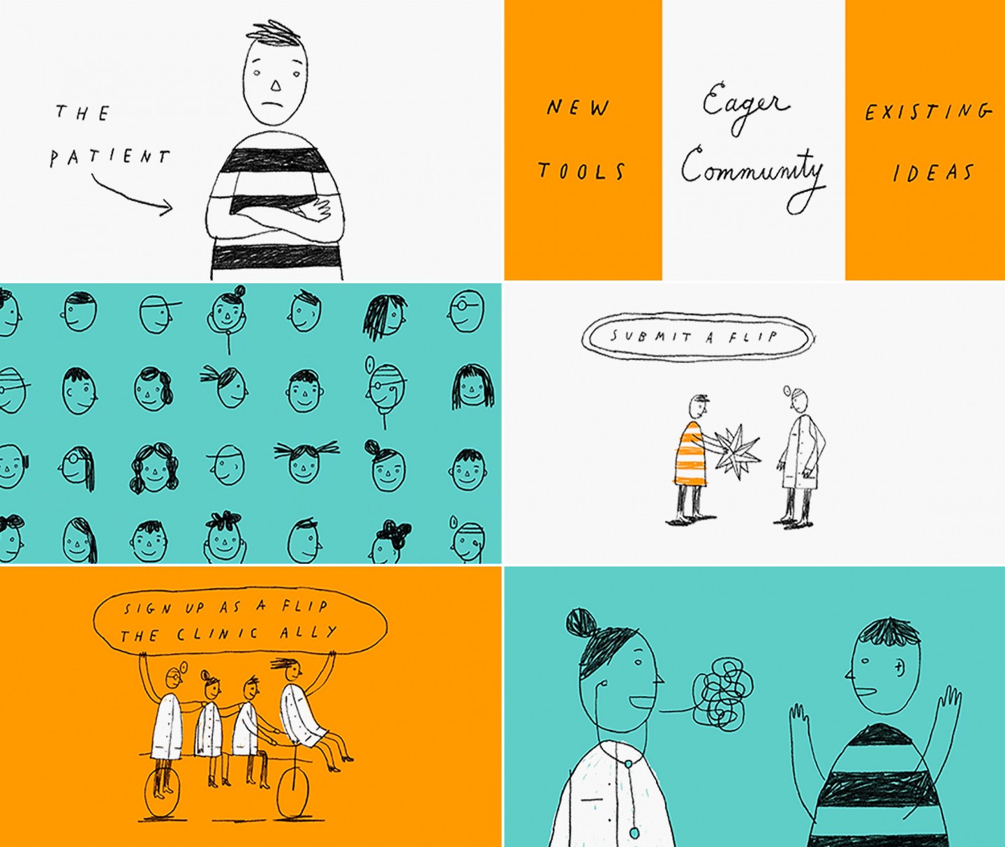 Flip the Clinic is an open experiment to transform the patient-clinician experience where patients and health practitioners improve medical care together. An initiative seeded by Thomas Goetz and the Robert Wood Johnson Foundation, its goal is for anyone connected to health care (practitioners, patients, caregivers, creatives) to develop “flips”—simple ideas to improve the doctor-patient interaction in some way.