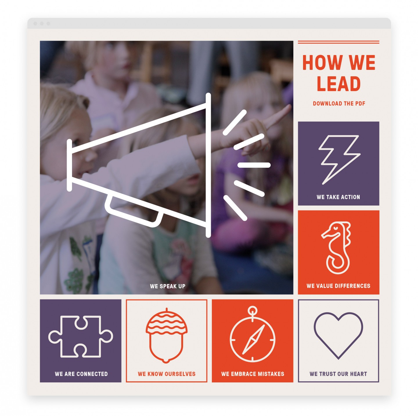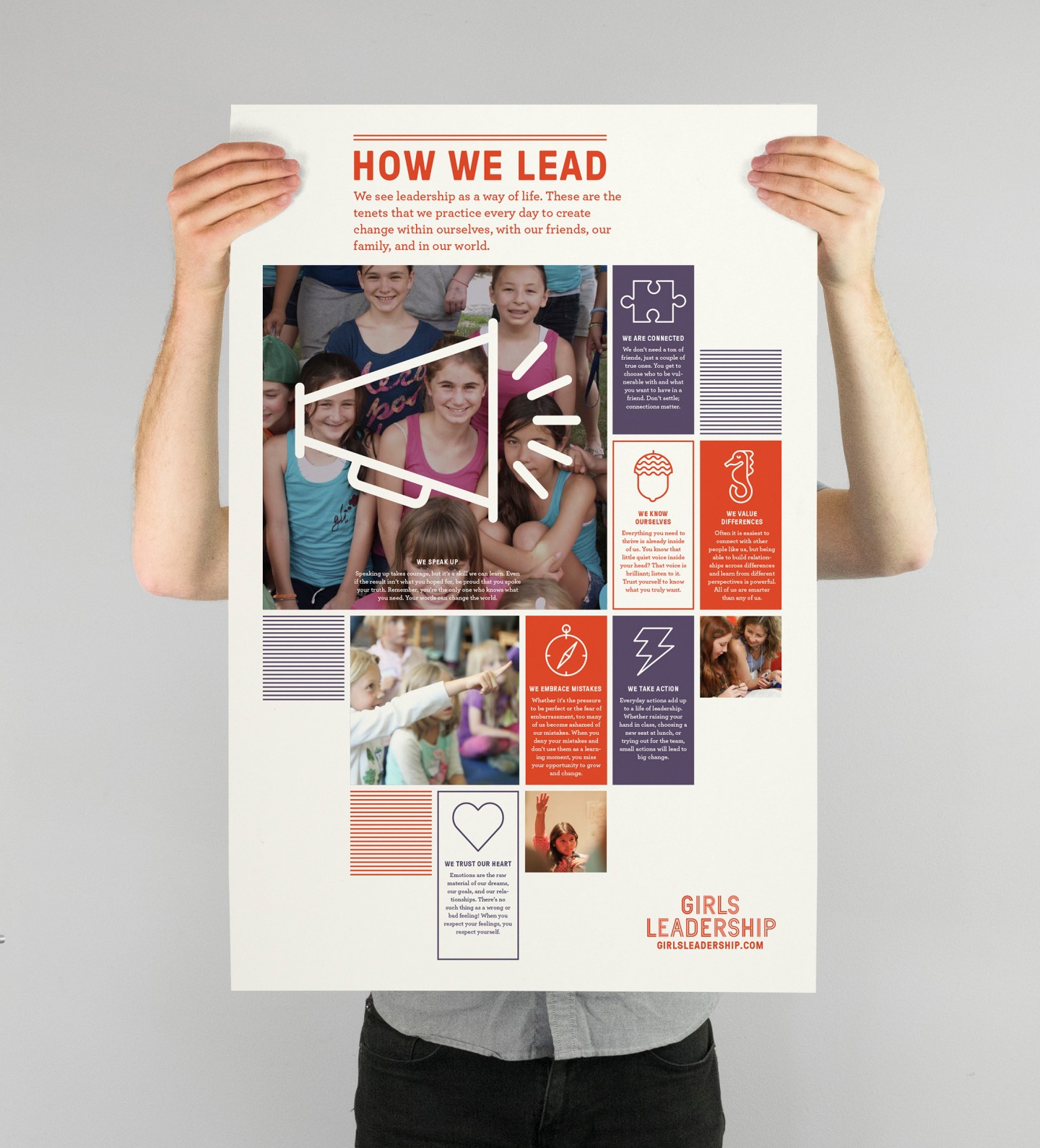 Through intimate collaborative workshops with the Girls Leadership staff, we pinpointed two main goals: 1) To create a brand that has more authority but retains a childlike exuberance, and 2) Expand the reach of Girls Leadership’s resources and curricula. In response to this strategic positioning we first created a brand that has an immediate simplicity and boldness, but upon deeper interaction reveals more nuance and personality. Then we redesigned the website to be more immediately impactful, while putting the Girls Leadership offerings up front and better organized.