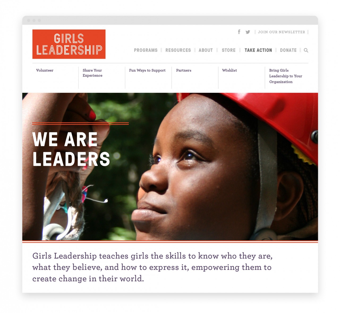Girls are not about ponies and the color pink. They are tough, smart, creative and powerful. Girls Leadership asked us to imagine a rebrand that reflects the ambition and strength of the organization, then construct a new website to better communicate this and connect people to its rich offerings.