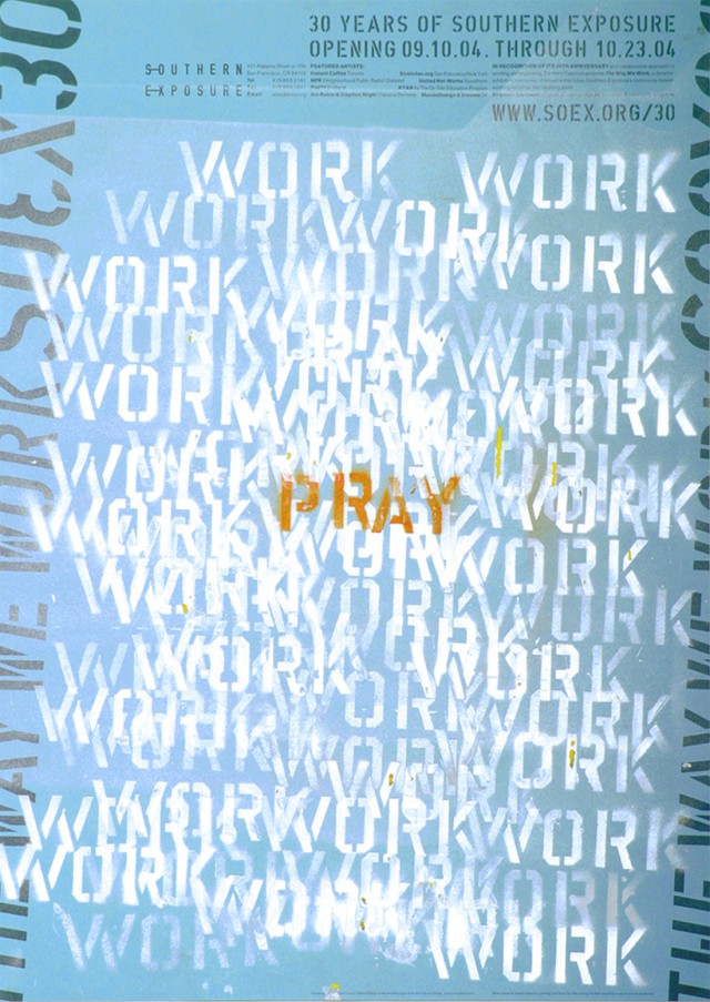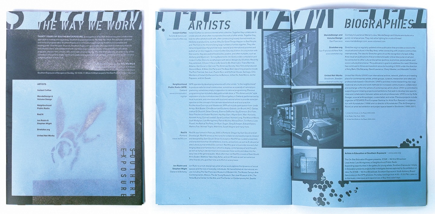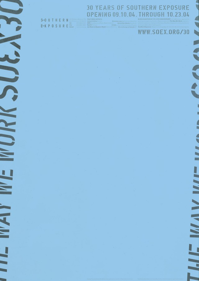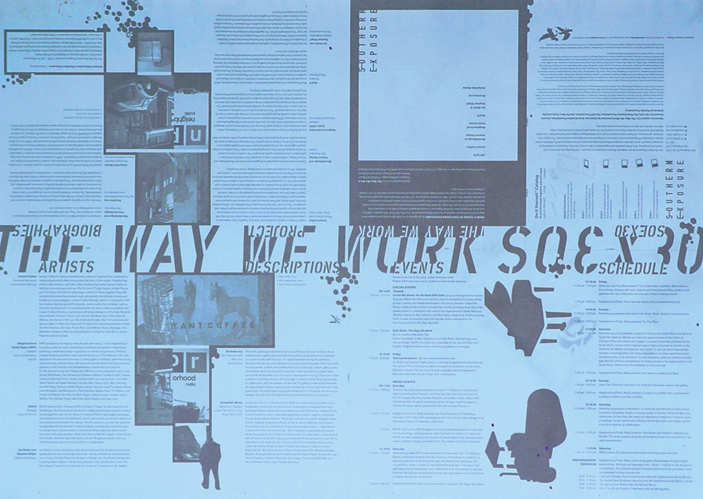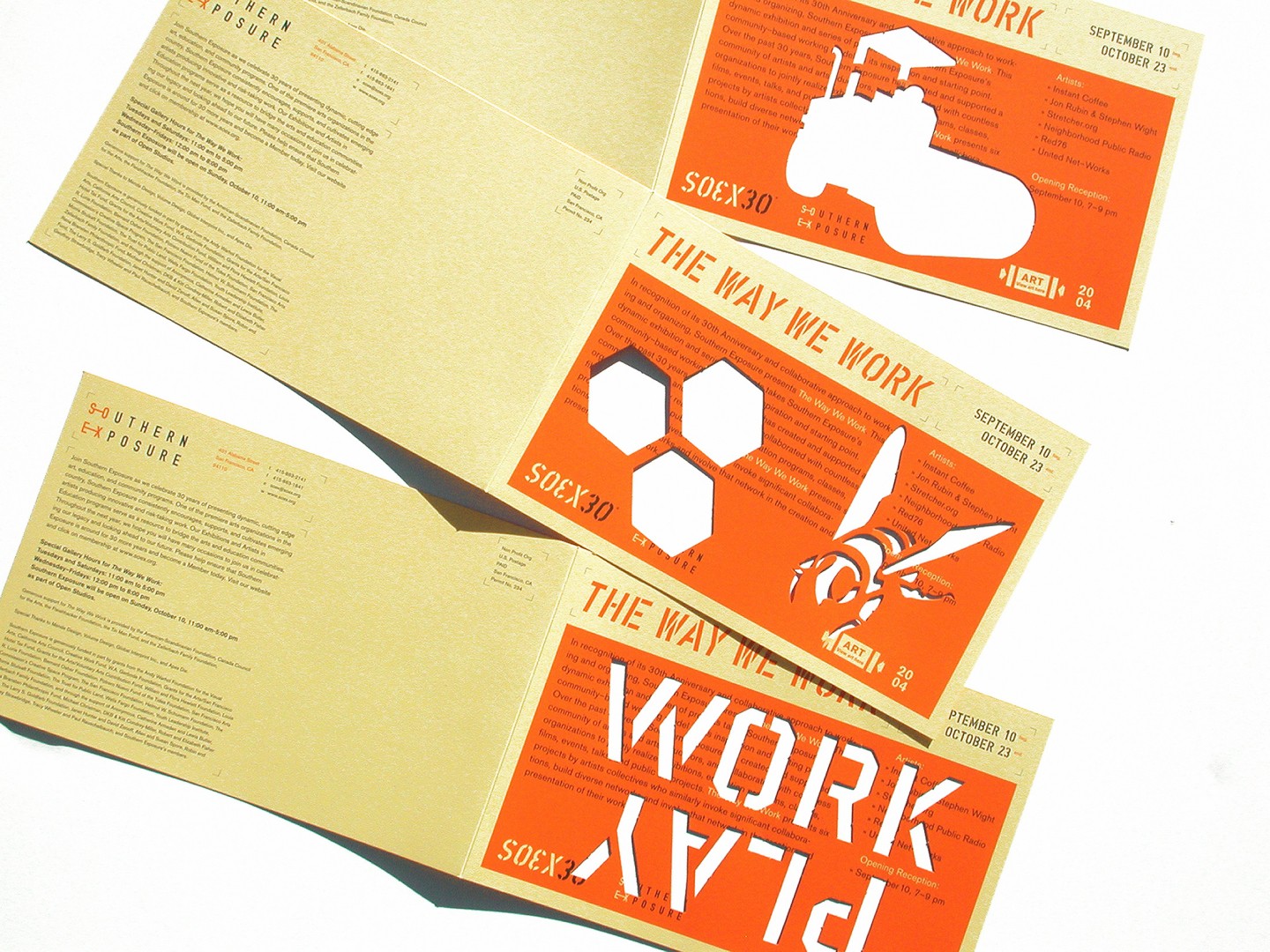 The Way We Work was an exhibit that featured artist collectives whose work was about the facilitation of art in various communities, often involving the public in the making of the actual finished work. Looking at this as an opportunity to question the traditional approach to the design of gallery announcements, we developed an ongoing graphic “event” that included the public in promoting the show.
